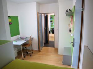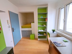 Ausgestattet mit Bett, Schreibtisch, Drehsessel, Bücherregal, Kleiderschrank, versperrbares Sideboard, Haussprechanlage, Dusche/Toilette, Internet (WLAN und LAN), TV-Anschluss.
